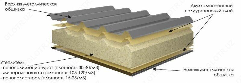 Схема в разрезе: два металлических листа и слой пенополиуретана между ними.